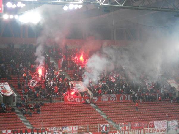 The extreme supporters after the first goal had been scored, waving flares around which caused the whole stadium to become some kind of smoke-sauna, and hanging paparazzi posters all over the rims of the playing field where the teams were matching against each other. They had also found a drummer from someplace who was starting up loud march-like tunes.