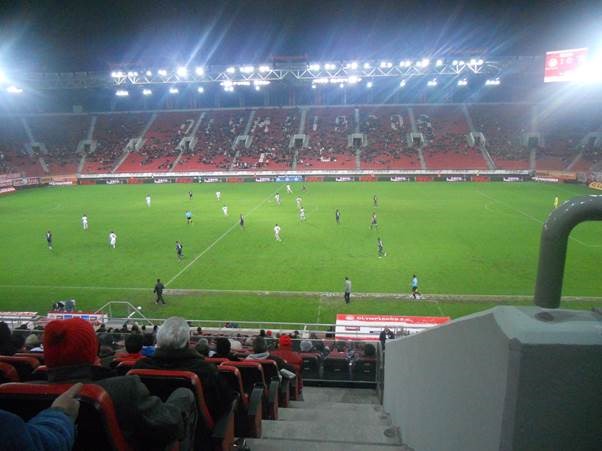 After going through Fast Track at Heathrow Terminal 5 and buying an ‘Italiano baguette’ at the Expresso shop in the corner (they had basil monin, lovely) we got on a BA direct flight to Athens, taking around 3 hours. Lunch was macaroni with bacon and mushrooms as well as some bath ovals with cheese and a ginger cake that tasted foul. On the flight I didn’t too much, read a bit of Wheel of Time: Eye of the World-I’m reading it again, because the story is just so complex and drew some of the snow-peaked mountains below into my chocolate draw-pad (thanks Cecily for that lovely SS gift). When we arrived at Eleftherios Venizelos, Athens’ international airport, we got a taxi and drove through the winding regions of Attica to the central part of Athens, and got off at the Herodion Hotel, with stunning views of the Acropolis and being a five minute walk from the new Acropolis museum, as well as having train, tram and bus services all nearby. However we only had enough time to dump our bags in our shoddy-looking first floor rooms not overlooking the Acropolis, but instead the noisy and rather dilapidated street in the opposite direction before we got back in our taxi and travelled to the Karaiskakis Stadium, the home stadium for Olympiacos FC, which sports the red and white colours.